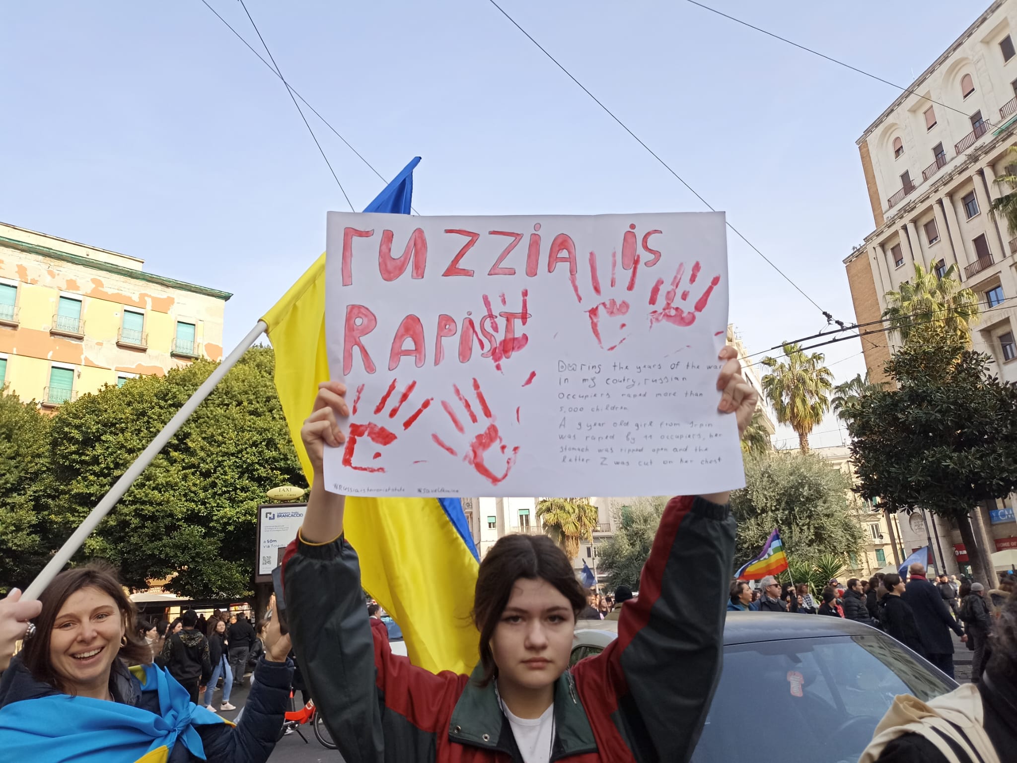 Gli ucraini – Alla marcia tanti gli ucraini presenti, che intonano l’inno del proprio Paese come monito per la vittoria contro l’invasore russo. Lara Levchun, mediatrice culturale, è responsabile nazionale del sindacato Labor. Da quando nel suo Paese d’origine parlano le armi, ha cercato di dare sostegno e manforte ai suoi connazionali giunti a Napoli e in Campania, oltre 20.000 secondo dati ufficiali. «I napoletani sono stati accoglienti dando cibo, mettendo a disposizione case ai rifugiati. Inserire qui delle persone fuggite dalla guerra resta però difficile. Sarebbe bene avere un canale ben chiaro sulle procedure di sostegno con la Questura e con la Prefettura per costruirsi un futuro. Oggi – si rammarica Levchun – questo canale non c’è più e molti cittadini abitano nei posti più piccoli della regione perché costa meno un affitto, pagato di tasca propria insieme all’acquisto del cibo e accudire i figli». Anastasìa, 16 anni, è tra i giovani del coro esibitesi dal palco con una canzone ucraina perfetta per l’occasione che tradotta in italiano significa “Il nostro cielo’’ che dovrebbe essere protetto dagli attacchi russi. «Cerco di parlare con gli altri ragazzi per quanto sta accadendo ma non tutti hanno capito cosa significhi la guerra. Io ho parenti ancora lì, non lontano da Kiev, ci dicono che i russi cercano di bombardare le varie centrali però tentano di rassicurare sul loro stato di salute». Kathrin è un’adolescente ucraina di 15 anni, è in Italia dal marzo 2022 ospite dell’Officina delle Culture Gelsomina Verde di Scampia, dove studia al Liceo Elsa Morante, dopo essere scappata da Kiev con la mamma. «Sono arrivata in treno qui passando per la Polonia. Il viaggio è durato 3 giorni, quasi senza acqua e cibo. Quando ci hanno rifocillato, non sapevo nemmeno in quale Paese fossimo». Kathrin teme che la guerra possa durare ancora tanto e spiega perché. «Mio fratello è rimasto lì a combattere e mi dice che la situazione è complicata, almeno per buona parte del 2023 le ostilità non si fermeranno. Lui è un po’ stanco psicologicamente dai continui combattimenti, dorme per terra con uno zaino di 40 kg non è facile. Io però voglio tornare a casa mia in Ucraina, stare con i miei amici e rivedere mia nonna che non è potuta venire in Italia perché si è rotta la schiena e poi perché non vuole lasciare la sua casa». La 15enne poi racconta: «Avevo un amico russo, più grande di me. Ora però ho interrotto i rapporti perché dice che la Crimea è russa ma quella per noi è l’Ucraina, non possiamo accettare invasori sulla nostra terra». «E’ trascorso un anno e nulla è cambiato. Oggi non avrei voluto essere qui per commemorare un anno di guerra ma avrei voluto salire su questo palco per festeggiare la pace. Spero che un giorno l’amore possa farci vivere in un mondo di pace in cui la guerra non esista», aggiunge Karina Samoylenko, ballerina del Teatro San Carlo con madre ucraina e padre russo.